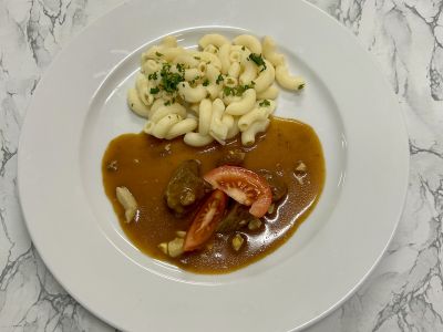 Hovězí guláš z plece zdobený cibulkou a beraními rohy, houskový knedlík nebo chléb