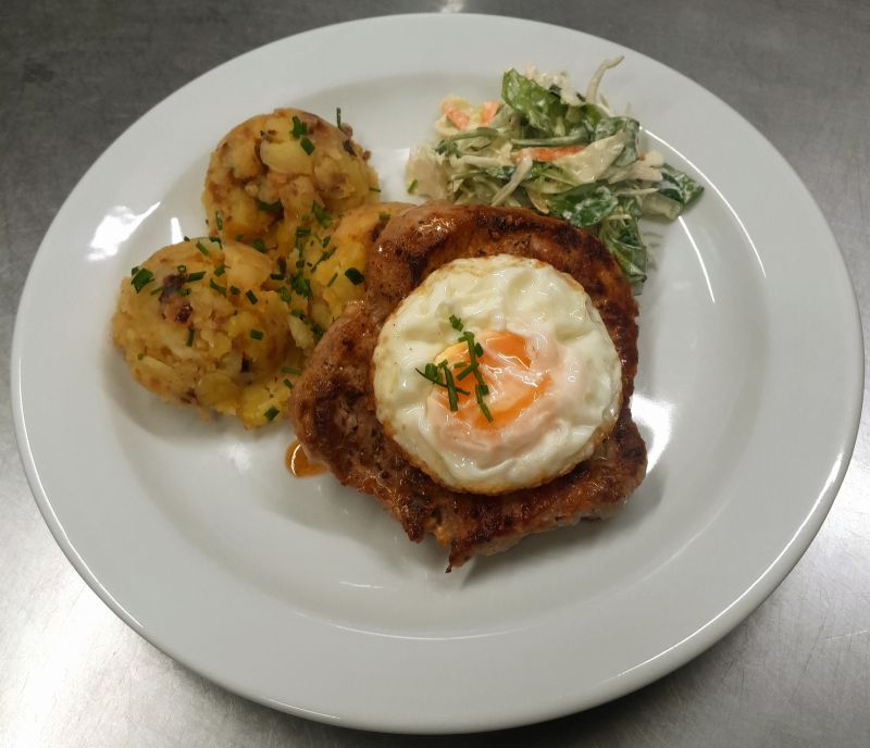 • 5. 150g Vepřová kotleta na grilu, sázené vejce, šťouchané brambory