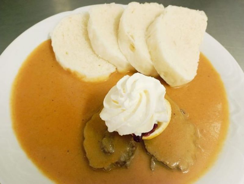 8. 150g Hovězí svíčková s brusinkovým terčem, houskové knedlíky249 Kč