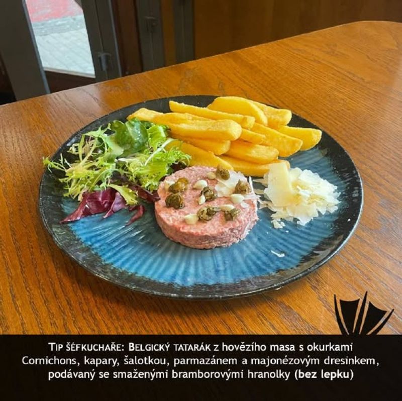1. TIP ŠÉFKUCHAŘE: BELGICKÝ TATARÁK z hovězího masa s okurkami Cornichons, kapary, šalotkou, parmazánem a majonézovým dresinkem, podávaný se smaženými bramborovými hranolky (bez lepku) 100g 3710196 Kč