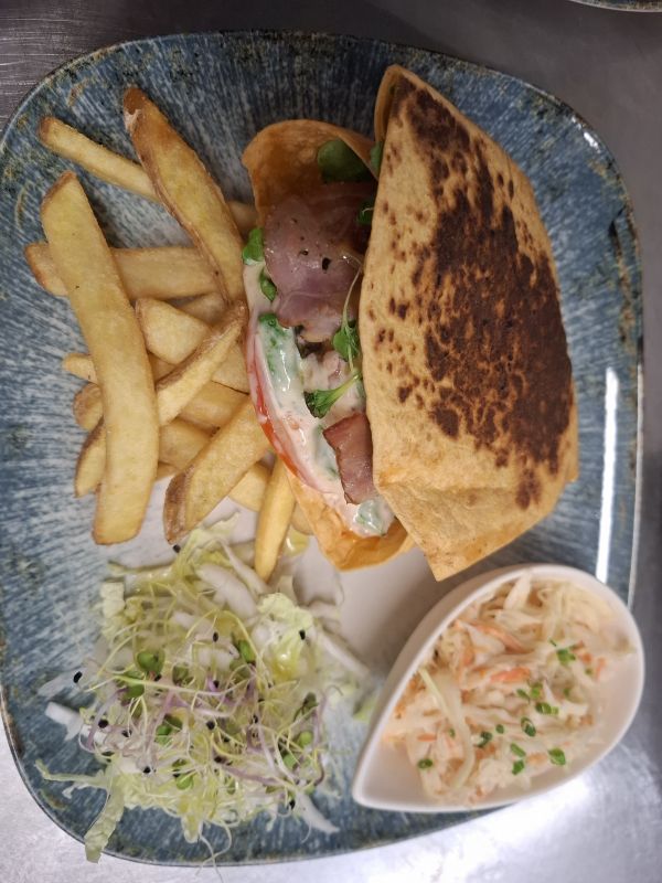 3. 200g Tortilla BACON BURGER - grilované hovězí maso v tomato tortille, chedar sýr, opečená slanina, naše slaninová majonéza, čerstvá zelenina, steakové hranolky, fresh Coleslaw salát229 Kč