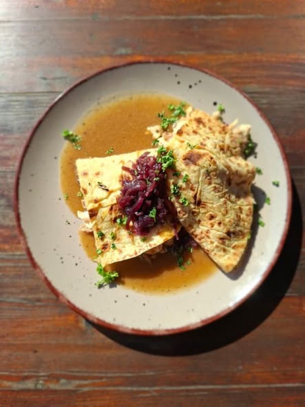 4. Trhané kuře v bramborové placce karamelizovaná cibule I dušené křimické zelí l drůbeží šťáva175 Kč