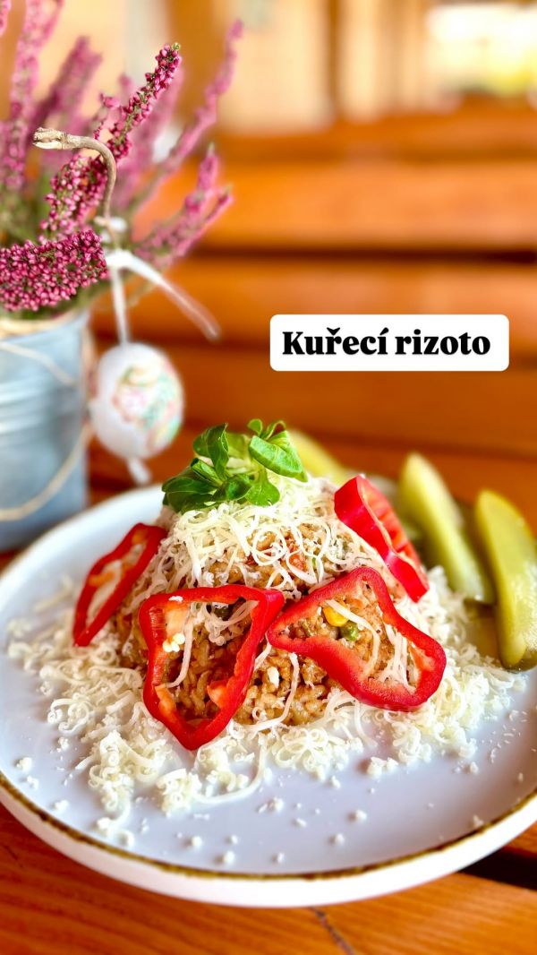 1. 350g Kuřecí rizoto se zeleninou a sýrem, kyselá okurka /A7, 10/119 Kč