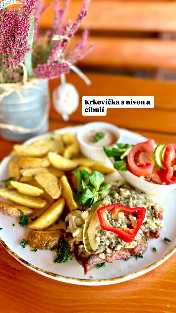 2. 150g Vepřová krkovička s nivou a cibulí, americké brambory, ďábelka, salát /A1, 3, 7, 10/139 Kč