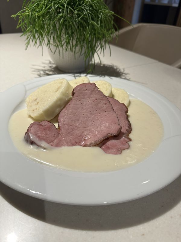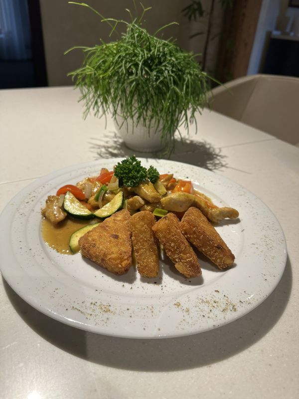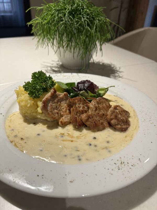 3. Šťavnatá vepřová kotleta plěná sýrem a křupavou slaninou, servírovaná se šťouchanými bramborami225 Kč