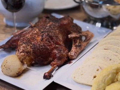 - 350g Konfitované kachní stehno, zelí z červené řepy, bramborové noky na másle375 Kč