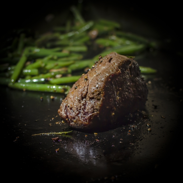 Vepřový steak na restovaných fazolkách, americké brambory159 Kč