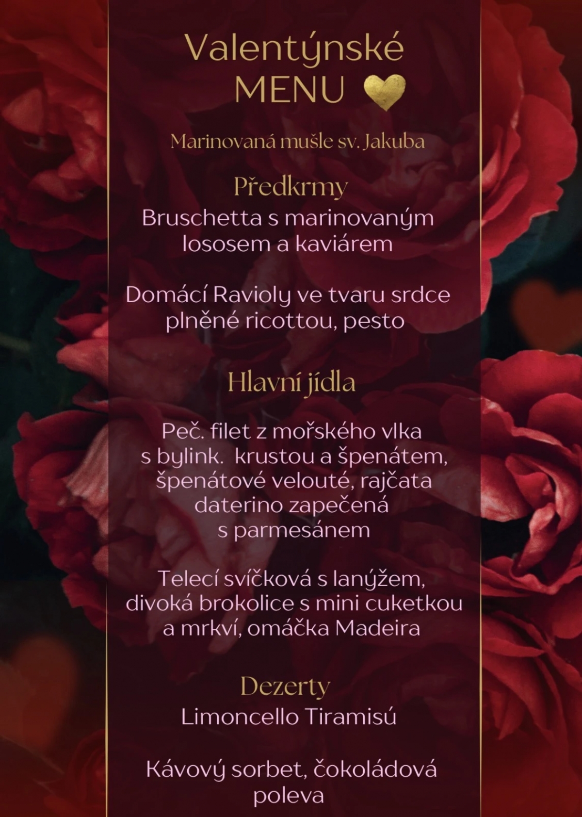 Připravili jsme fantastické Valentýnské menu na den sv. Valentýna. Užijte si den zamilovaných v naší romatické Restauraci v srdci pražských Vinohrad!