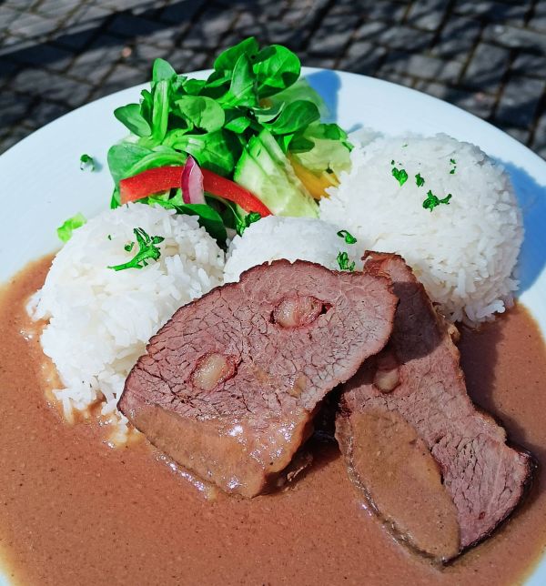 1. Hovězí pečeně špikovaná iberijským špekem s omáčkou z pečeného česneku s jasmínovou rýží199 Kč