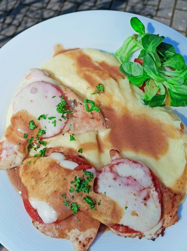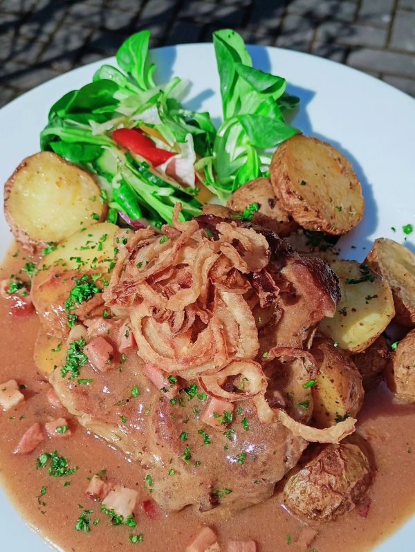2. Steak z vepřové krkovičky v cibulové krustě s pečenými plátky brambor a tatarskou omáčkou179 Kč