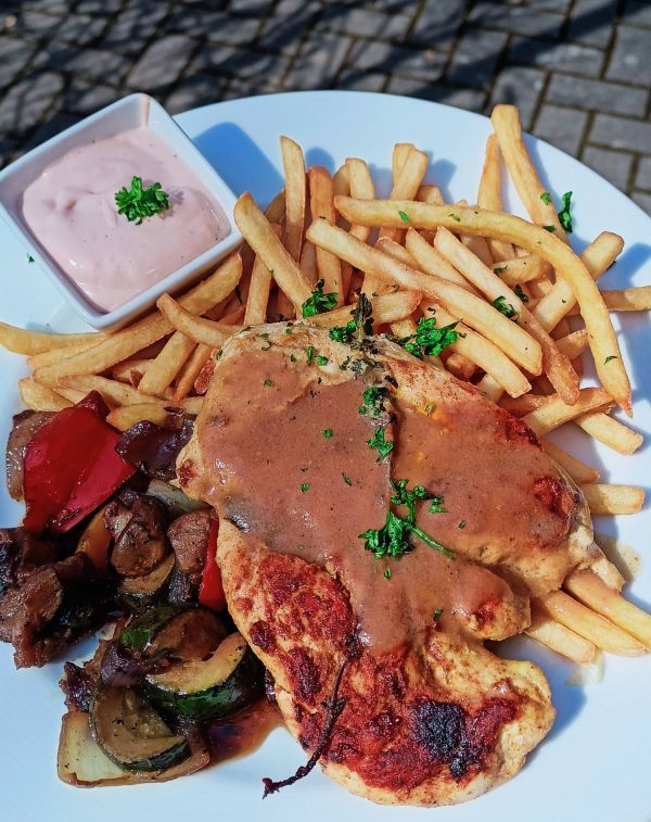 3. Kuřecí prsíčko s grilovanou zeleninou na olivovém oleji a tymiánu s hranolky a koktejlovou majonézou175 Kč