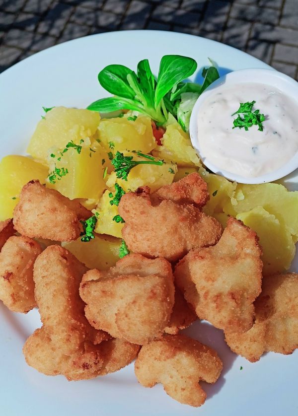3. Smažené řízečky z vykoštěných kuřecích stehýnek marinovaných v čerstvém česneku s bramborovým salátem175 Kč