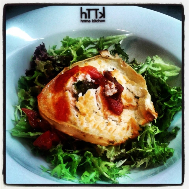 1. Teplý salát s restovanými rajčaty, pečeným lilkem, chlebové krutony v rajčatové omáčce, kozí sýr, jarní cibulka, granátové jablko265 Kč