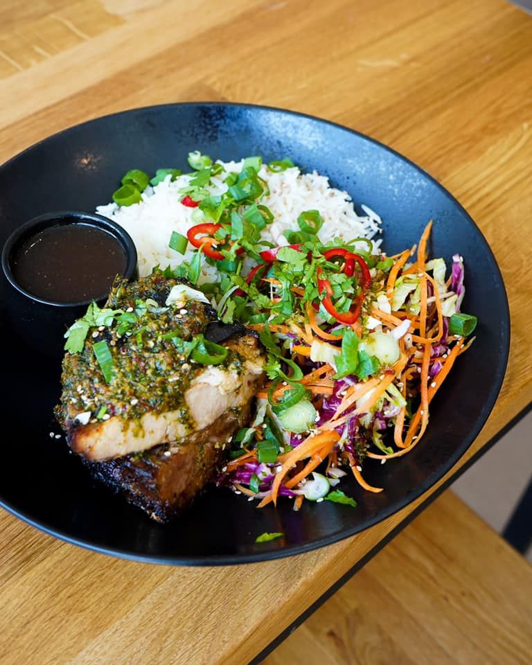 1. TERIYAKI KUŘE jasmínová rýže/kuřecí prso/teriyaki omáčka/sójová omáčka/čínské víno/zázvor/česnek/nakládaná cuketa/koriandr225 Kč