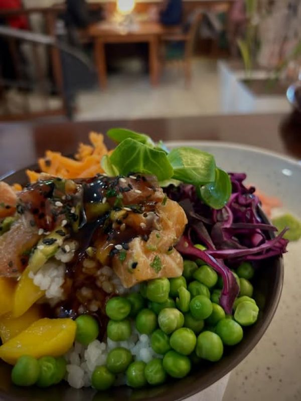 4. POKÉ s lososem/ tofu (rýže, zelí, mrkev, mango, wakame, edame, sezam, ústřičná om., vasabi, koriandr)199 Kč