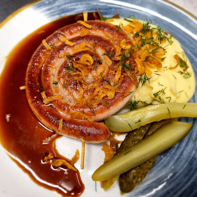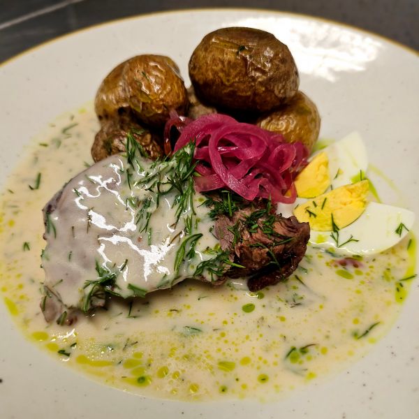 7. 150g Pomalu pečené hovězí lýtko na červeném víně s kořenovou zeleninou, bramborová smetanová kaše225 Kč
