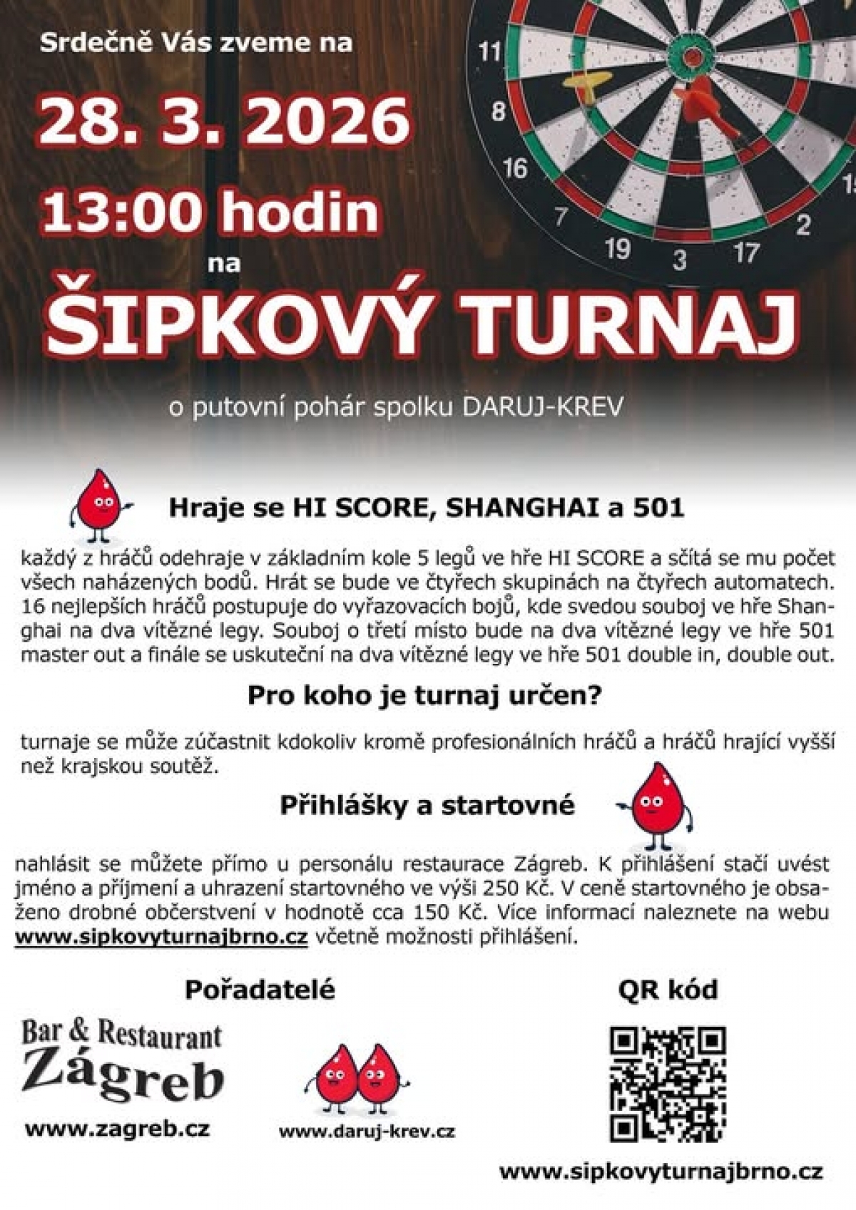 Zveme vás na šipkový turnaj o putovní pohár spolku DARUJ-KREV. Přijďte si zahrát, pobavit se a poměřit síly s ostatními hráči!