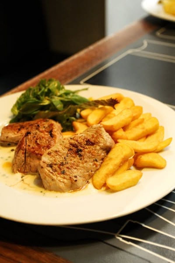 5. Steak z vepřové panenky, gril. kukuřice na másle, dollar chips, slaninová majonéza199 Kč