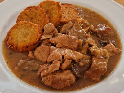 140g dančí ragů na víně se zeleninou, tyrolský knedlík 137912