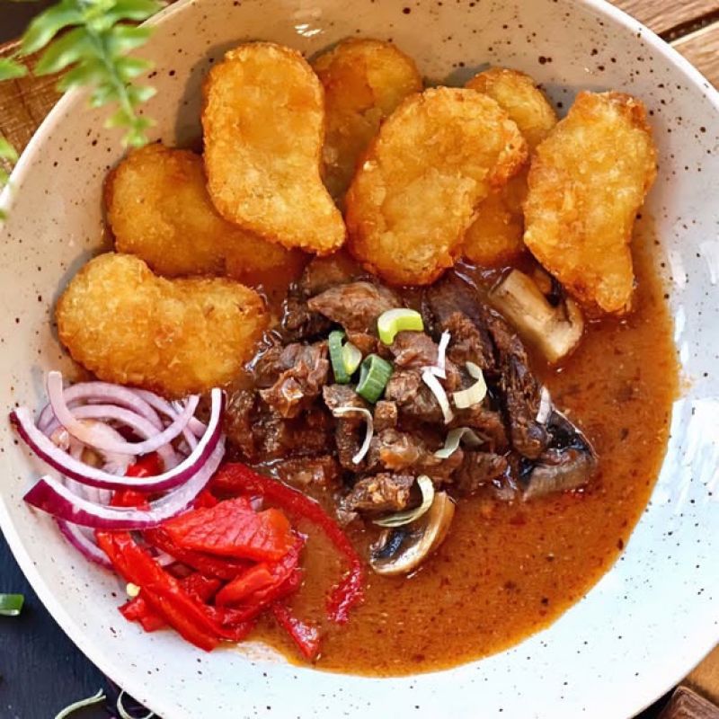 3. 250g GRILOVANÁ VEPŘOVÁ KRKOVICE s cibulo-hořčičnou omáčkou a pečenými panchettovými grenaille brambůrkami345 Kč