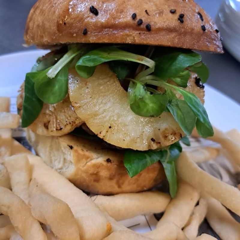 10. 1ks Hawai Hamburg vepřovým mletým masem, sýrem s domácí bulkou Alice, ananasem, slaninou, okurek, rajčaty, ledovým salátem, pizza hranolky249 Kč