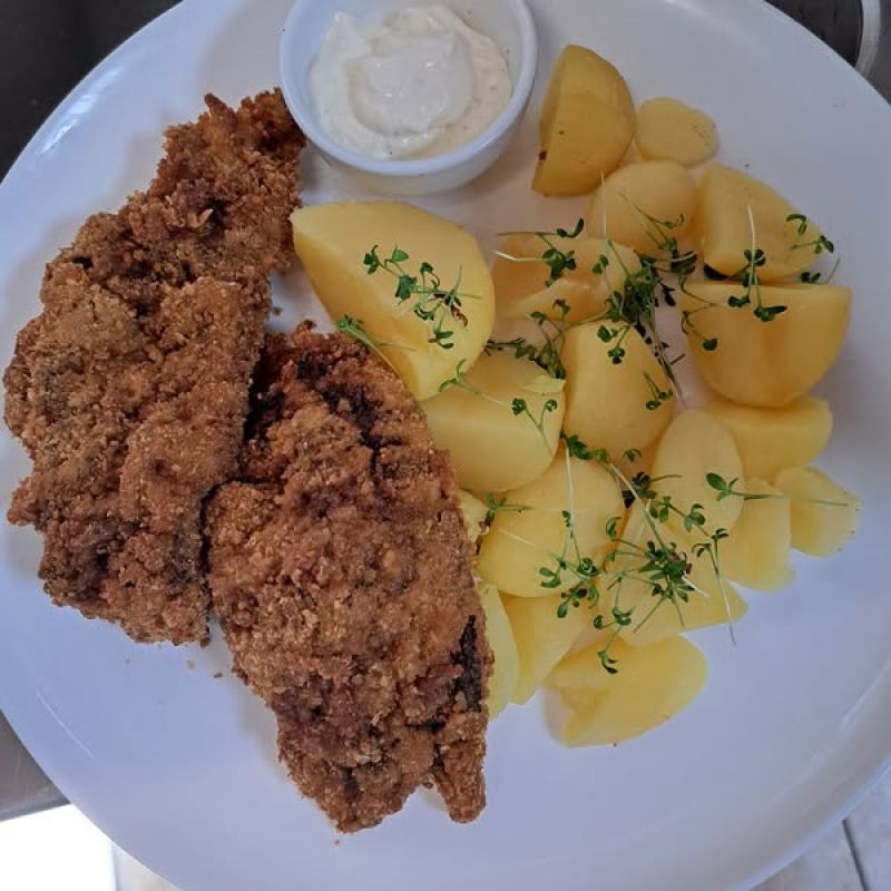 1. 120g Přírodní řízek zapečený s nivou, vařené brambory179 Kč