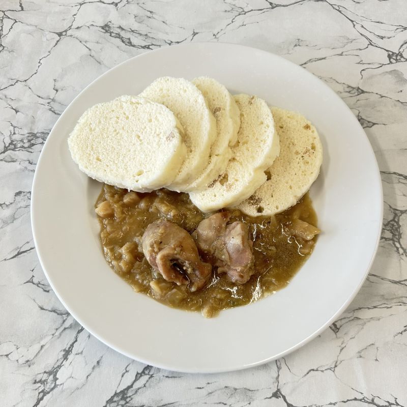 2. pštrosí vejce (mleté maso), bramborová kaše, okurek105 Kč