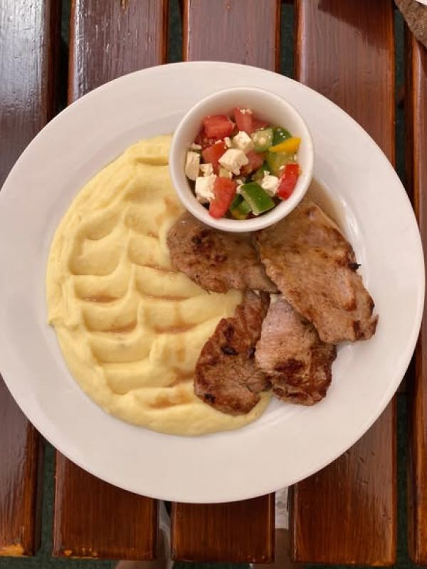 1. (150 g) MEDAJLONKY Z VEPŘOVÉ PANENKY se šlehanou bramborovou kaší, silnou omáčkou a šopským salátem155 Kč