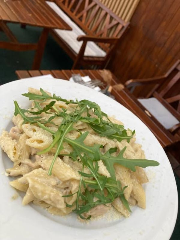 2. (140 g) KUŘECÍ STEAK S PARMAZÁNOVÝM KRÉMEM podávaný s bramborovými kroketami a zdobený spečenou anglickou slaninou155 Kč