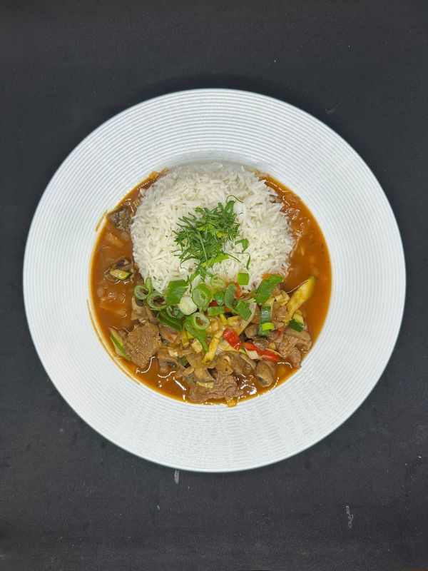 1. Nudličky z mysletínské telecí kýty a čerstvé zeleniny s žampiony s pečenou jasmínovou rýží368 Kč
