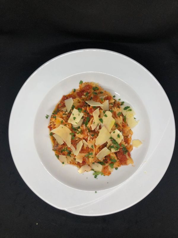 3. Tagliatelle s restovanými kousky krůtích prsou, drcenými rajčaty, salátem rukola a parmazánem Gran Moravia187 Kč