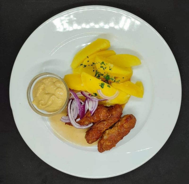 2. Čevapčiči z mysletínského hovězího krku, s vařenými petrželkovými bramborami se šalotkou a hořčicí187 Kč