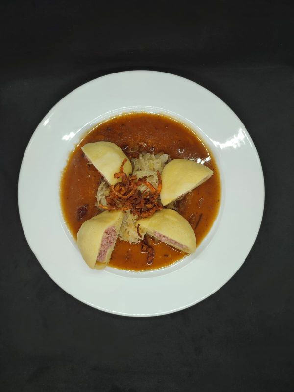 3. Domácí bramborové knedlíky plněné uzeným lišovským bokem, s kysaným zelím a do zlatova smaženou vídeňskou cibulkou187 Kč