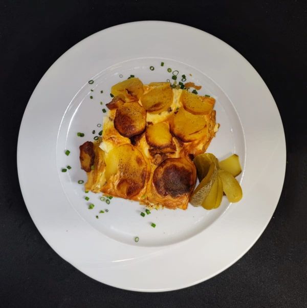 2. Domácí bramborové knedlíky plněné špenátem, s omáčkou z brynzy a zakysané smetany sypané vypraženou slaninou178 Kč