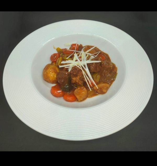 5. Mysletínská telecí jatýrka dušená na červeném víně se šalotkou, lišovskou slaninou, pečenými jablky, se šlehanou máslovou bramborovou kaší197 Kč