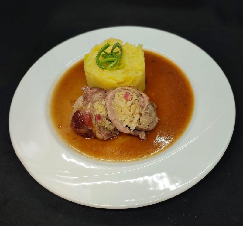 2. Plněný kapustový list mysletínským hovězím, se šťouchanými bramborami s jarní cibulkou178 Kč