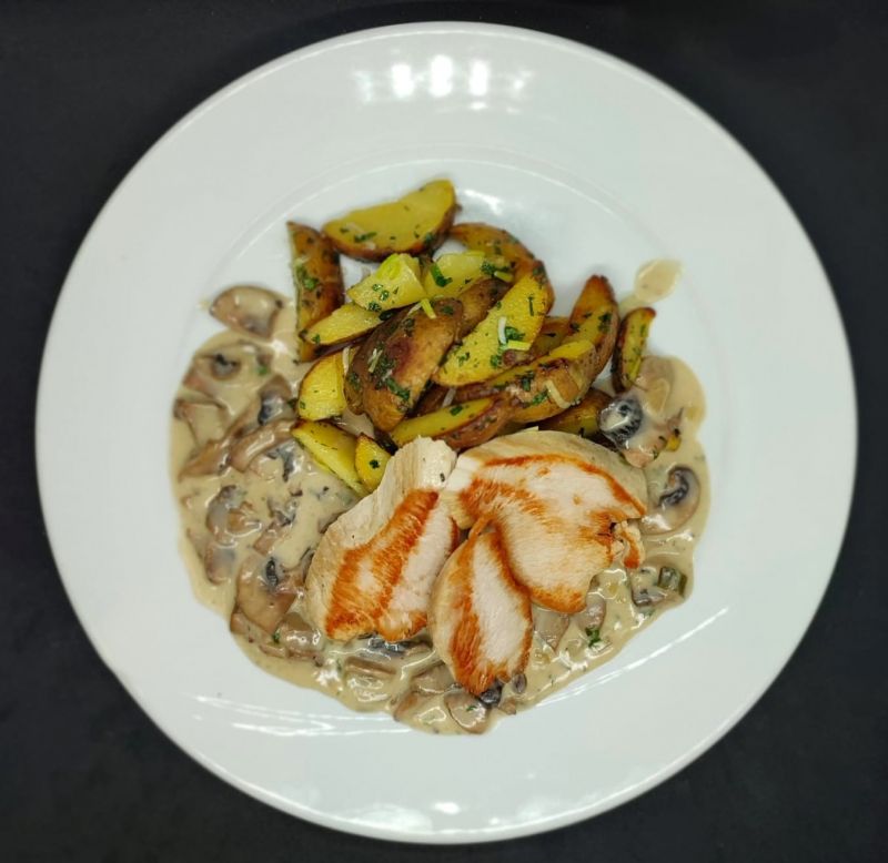 2. Krůtí prso připravené sous-vide s ragú z čerstvých žampionů a smetany, s restovanými bramborami s jarní cibulkou187 Kč