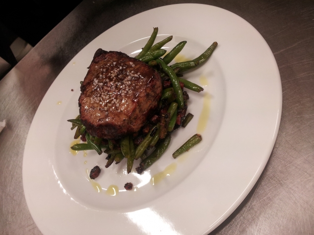 • 200g Špalíčky vepřové panenky v anglickém kabátku s omáčkou ze zeleného pepře zjemněnou brandy, zámecké brambory 17910