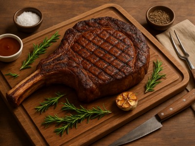 2. 130 g Steak z vepřové kotlety s anglickou slaninou a cibulkou podávaný s pečenými brambůrky grenaille 1, 7163 Kč