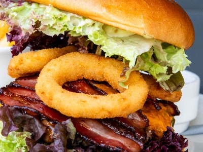 3. Pšeničná tortilla (plněná marinovaným vepřovým masem, BBQ omáčkou, kukuřicí, karamelizovanou cibulí a sýrem čedar), smažené bramborové hranolky, zauzený dip175 Kč