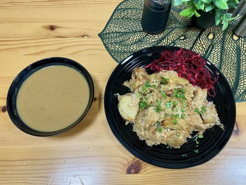 1. BL, V Zapečené brambory s Otickým kysaným zelím, kostičkami tofu zdobeno hladkolistou petrželkou, salát z červené řepy s jablky a badyánem, bylinkový čaj 69130 Kč