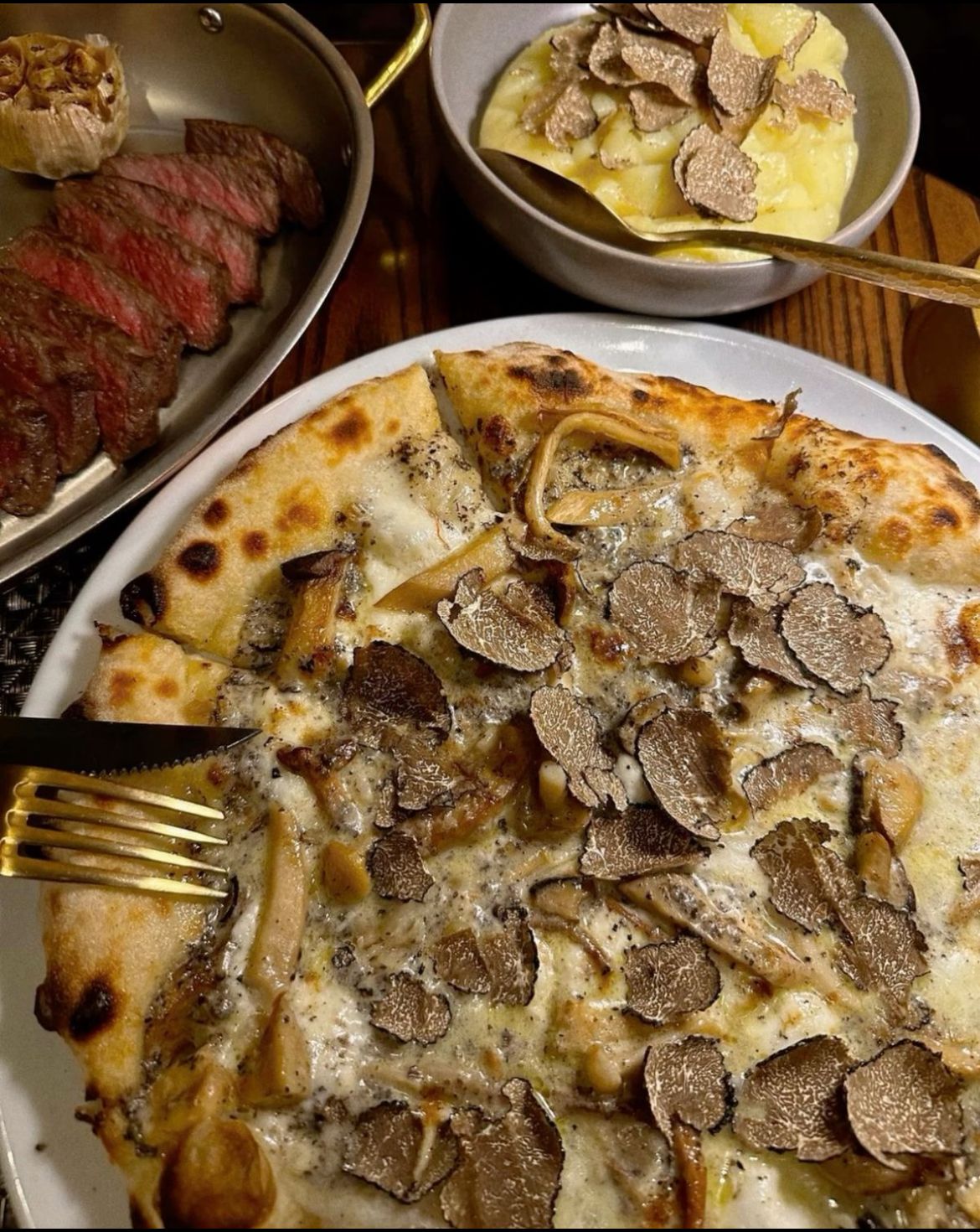 10. QUATTRO FORMAGGI - smetana, gorgonzola, mozzarella, provola, hobliny parmezánu / cream, gorgonzola, mozzarella, provola, Parmesan shavings1, 7189 Kč