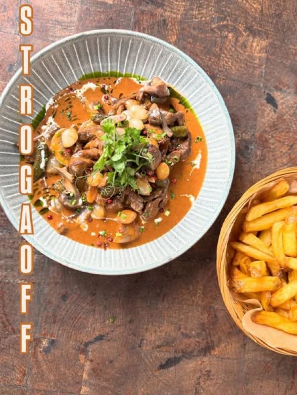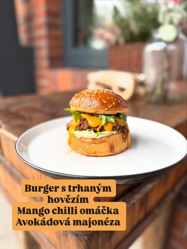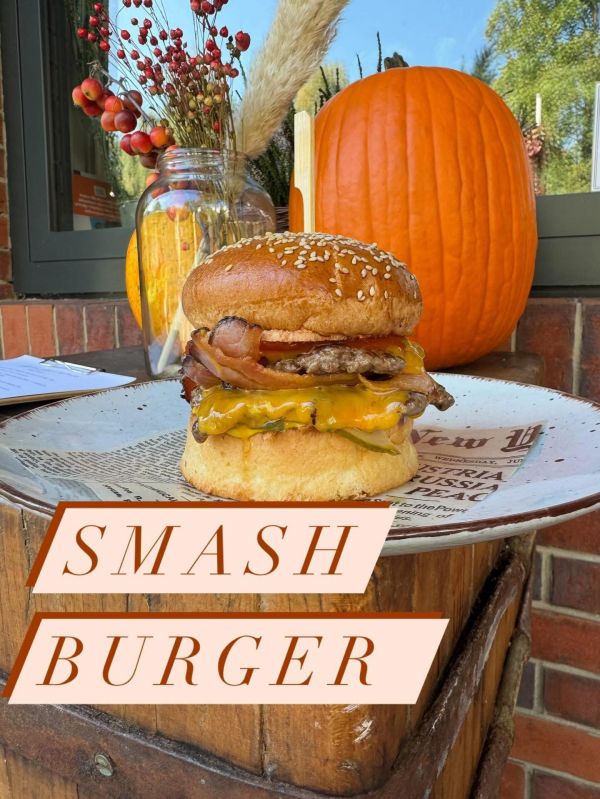 Hovězí smash burger, domácí kečup, francouzská hořčice, cheddar, slanina, kyselá okurka, cibulka, hranolky269 Kč