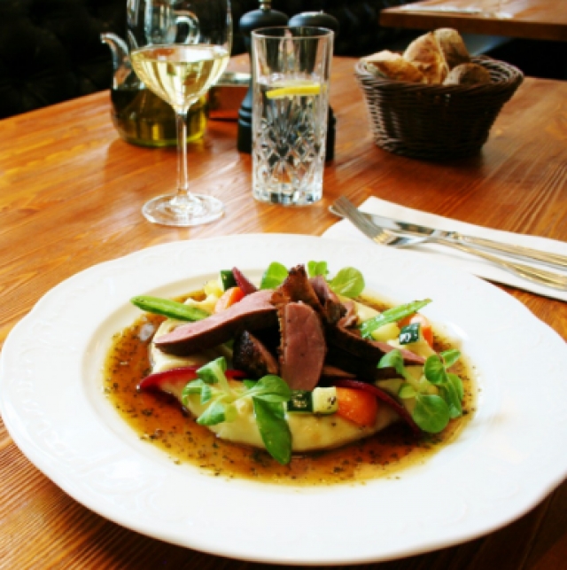 6. Listový salát, plátky kachních prsíček, rajčátka, pomerančový vinaigrette220 Kč