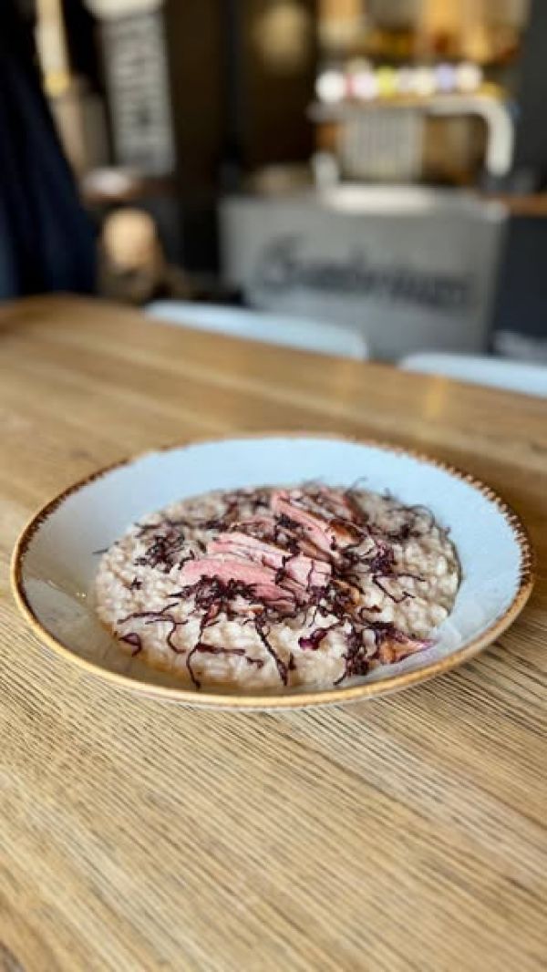 3. Risotto s červeným vínem a rozmarýnem, sous vide kachní prso, chipsy z červeného zelí199 Kč