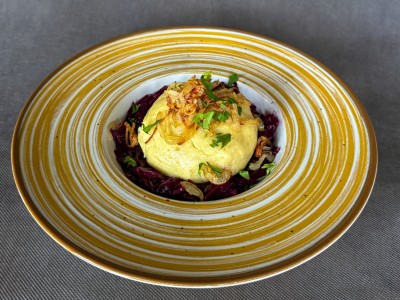 3. 120g Krůtí výpečky na česneku a tymiánu, kysané zelí, bramborové knedlíky