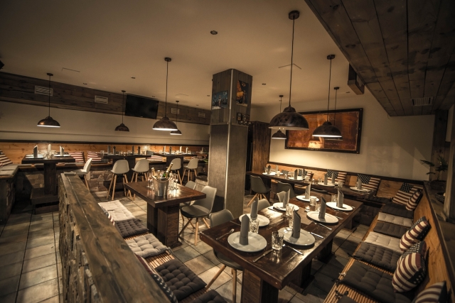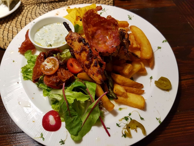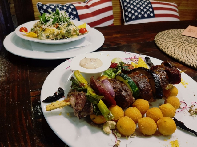 2. 175g Bavette Steak (steak z hovězího pupku, připravený na lávovém grilu) podávaný s pečenou bramborou plněnou pažitkovým dipem, restovanými kukuřičnými zrny s chorizem, cibulovým kroužkem a omáčkou demi – glace220 Kč