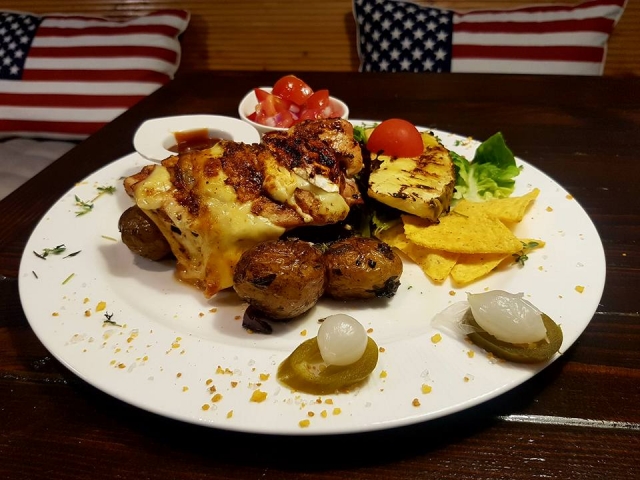 1. 150g Texas Grander Burger (máslová bulka plněná smaženým stehením řízkem, slaninou, Cheddarem, cibulí, mayo, BBQ omáčkou, ledovým salátkem) podávaný s domácími hranolkami a chorizo mayo190 Kč