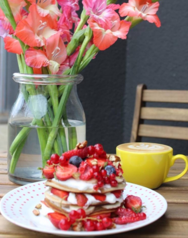 7. Perníkové lívance, vanilkový krém, strouhaná čokoláda, višně, pekany175 Kč