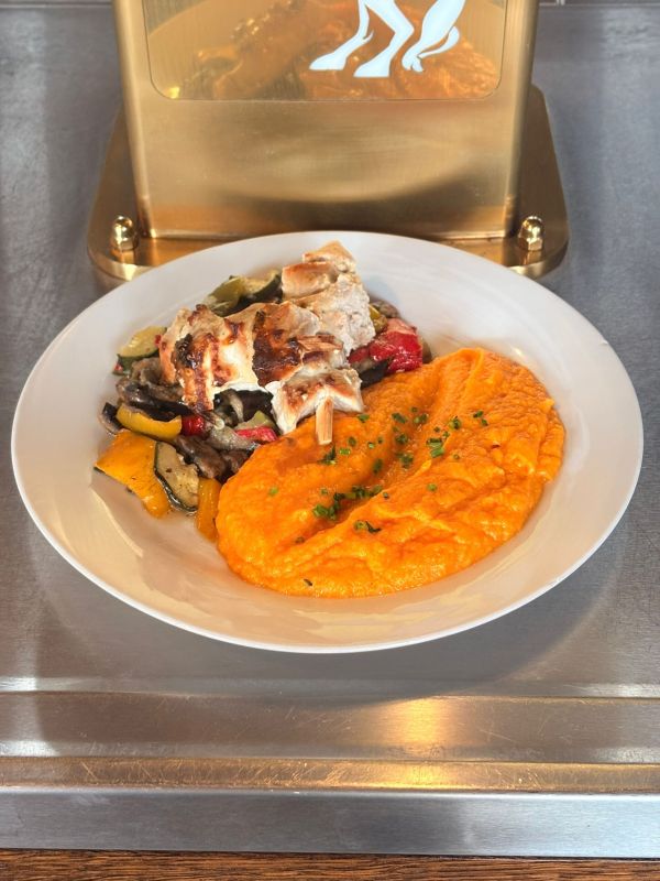 3. Přírodní kuřecí kapsa plněná sýrem, zeleným pepřem a šunkou, blanšírovaná zelenina prohozená na másle165 Kč